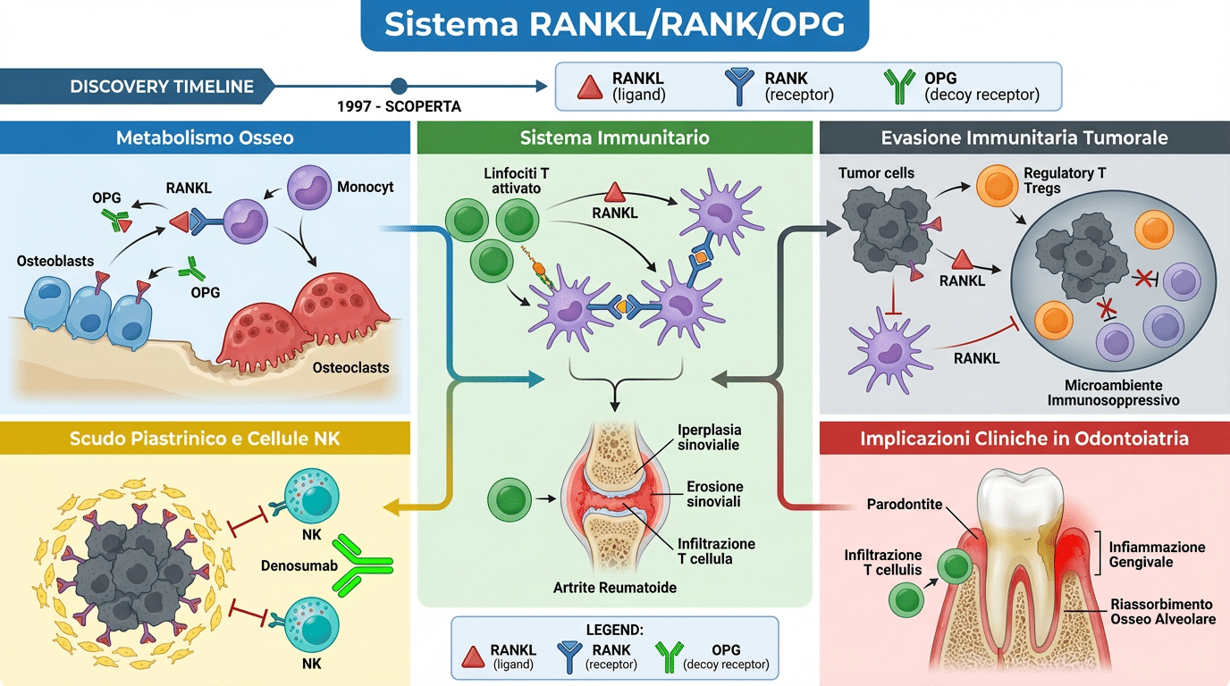 Il sistema RANK/RANKL/OPG governa il rimodellamento delle ossa mascellari. Ogni estrazione. Ogni impianto. Ogni movimento ortodontico. Tutto passa attraverso questa triade.